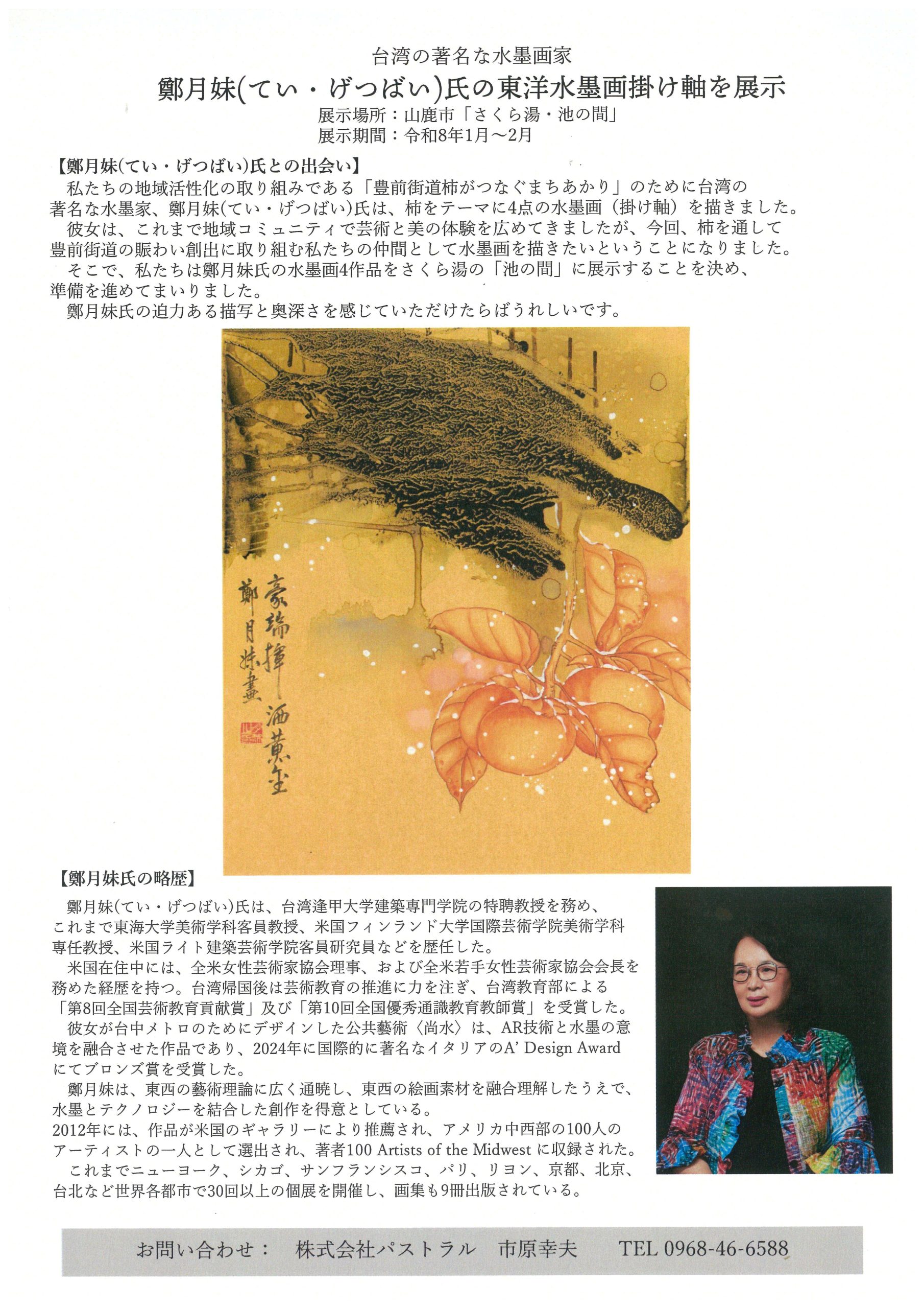 さくら湯の池の間において、台湾の著名な水墨画家である鄭月妹(テイゲツバイ)氏の作品(掛け軸)を展示公開しております。